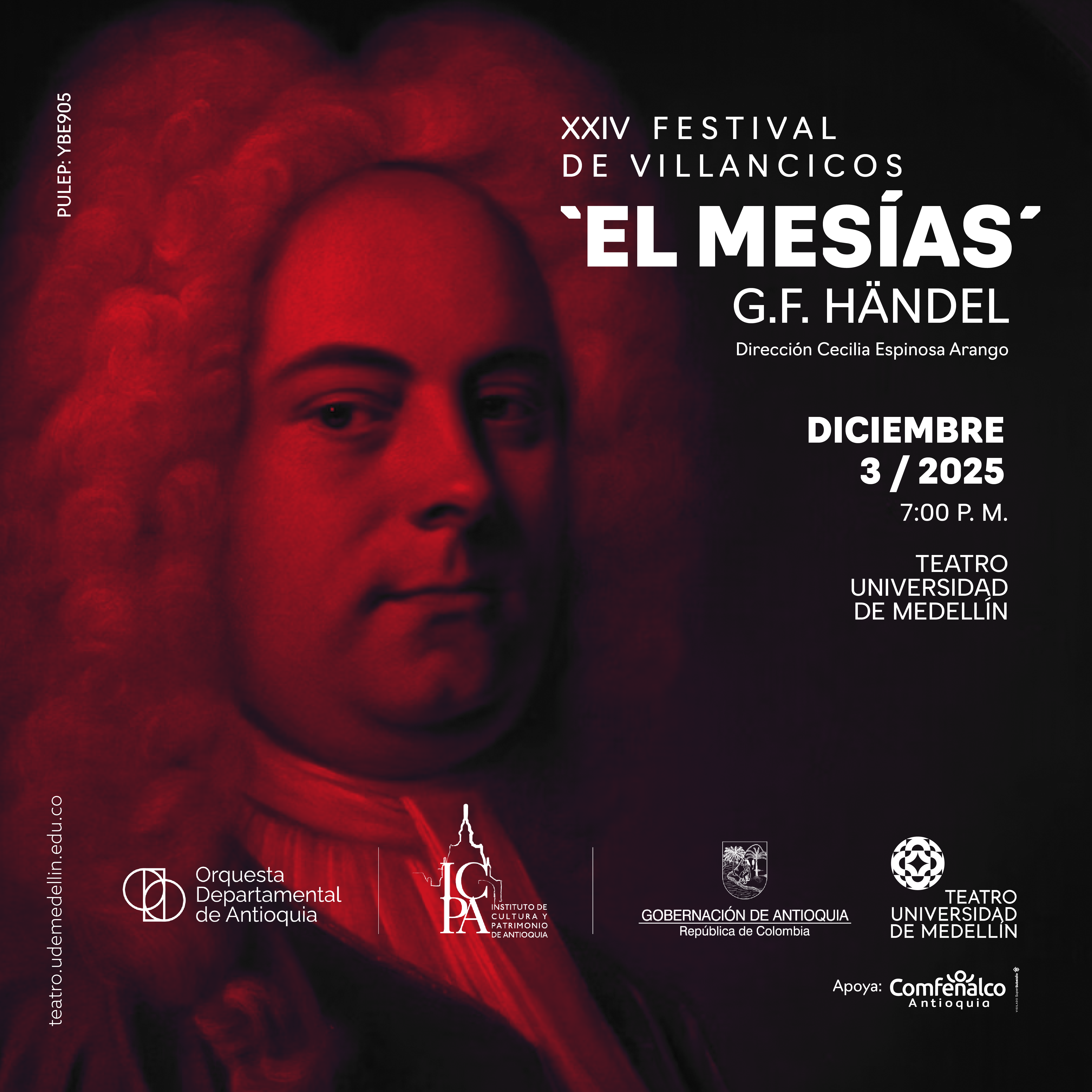 El concierto se llevará a cabo el 3 de diciembre a las 7:00 p. m. en el Teatro Gabriel Obregón Botero, con entrada libre mediante boletería. Bajo la dirección de Cecilia Espinoza, los solistas Lina López, Yennefer González, Juan Pérez y Alexis Trejos interpretarán, junto a la Orquesta y los coros de Cámara de la Universidad de Medellín, Coral Tomás Luis de Victoria y Tonos Humanos, la obra maestra El Mesías, del compositor Georg Friedrich Händel. Este célebre oratorio, creado en 1741, fusiona la grandeza del estilo barroco con un profundo mensaje espiritual sobre el nacimiento, la pasión y la resurrección de Cristo. Su icónico “Aleluya” ha trascendido el tiempo como símbolo universal de alegría y esperanza.